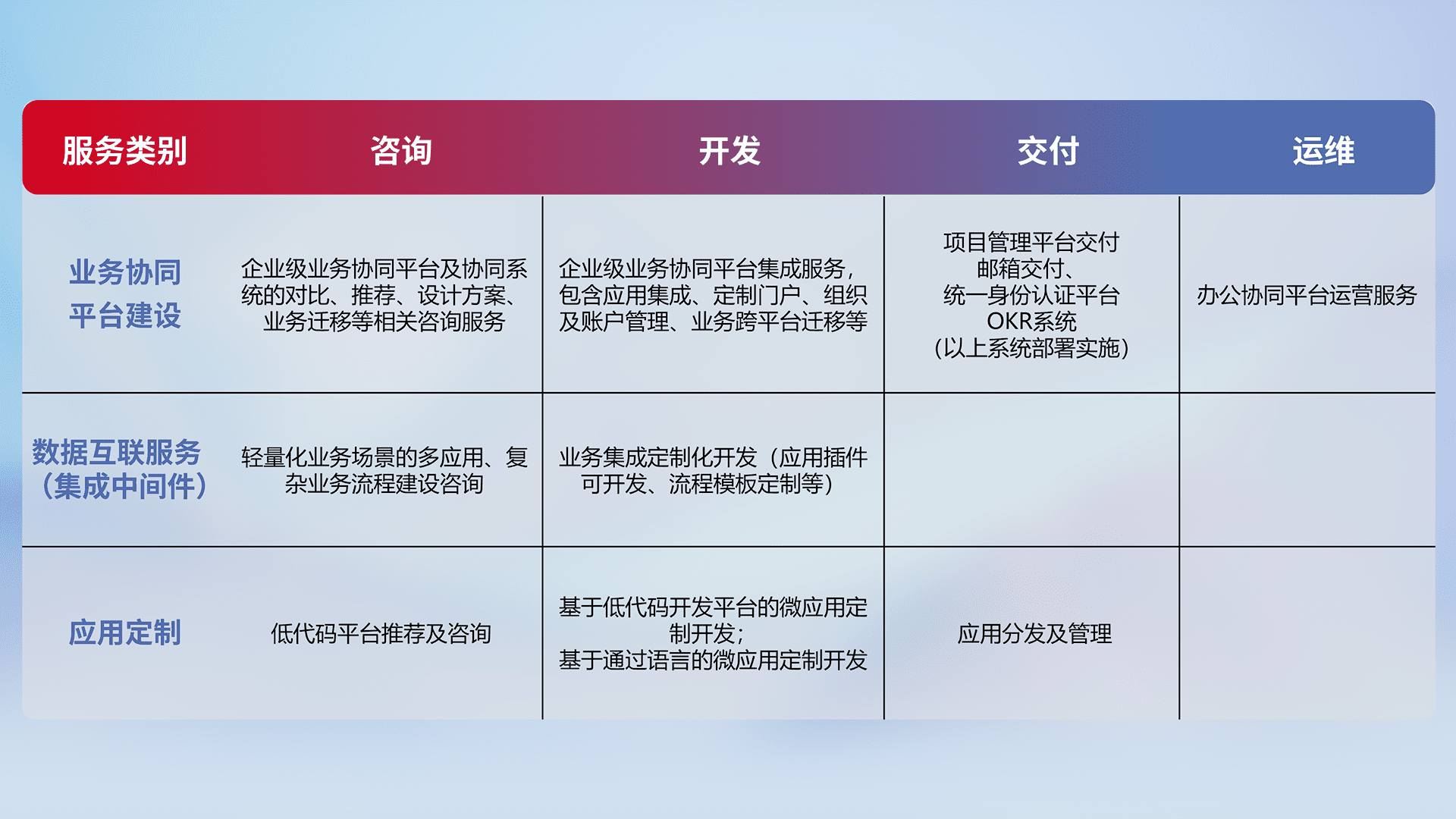 针对钉钉、、、、企微、、、IDaas等平台级产品提供产品的规划、、方案、、、、交付、、、定制化开发等服务,,,,实现如统一协同办公、、智能客户服务、、混合会议管理、、、、智能数据查询、、、、等业务场景,,,实现数字化转型。。。