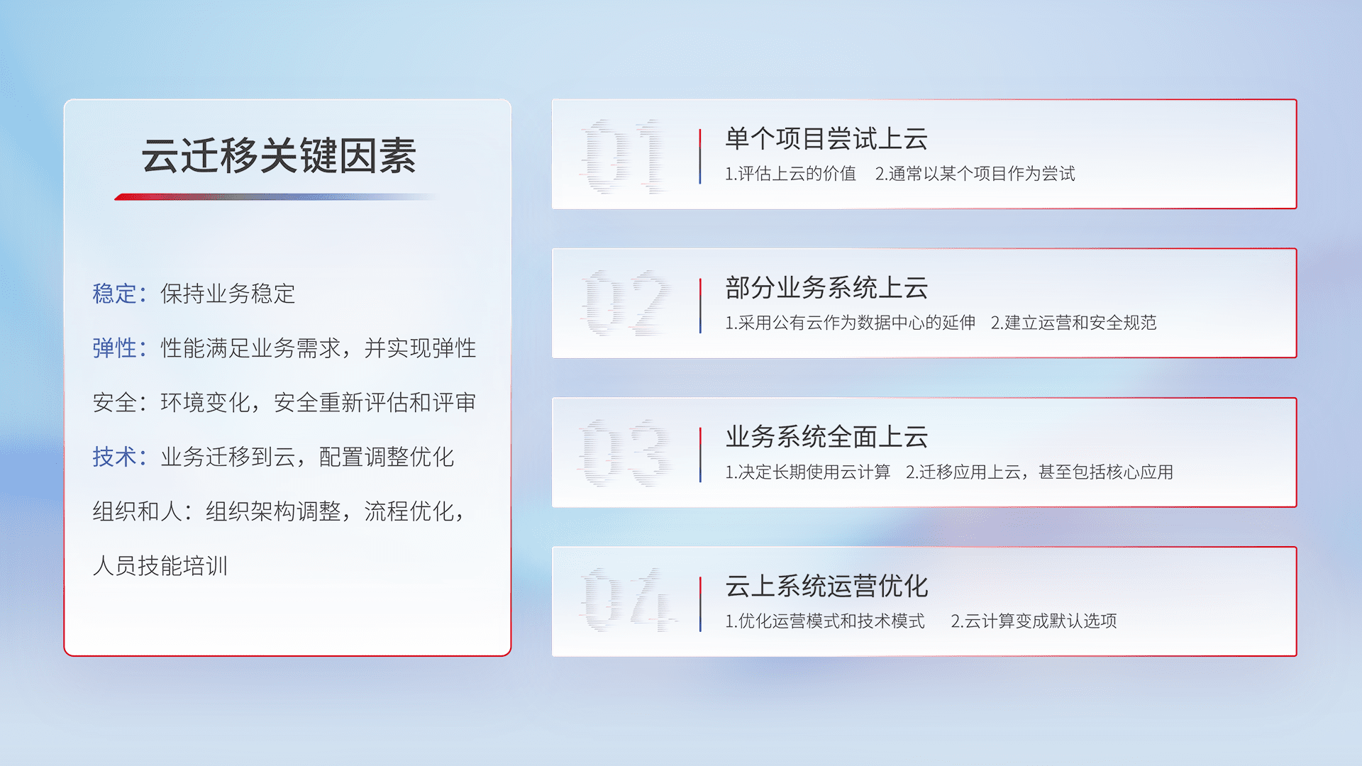 结合实际业务,,,从规划设计、、云平台选型、、云原生改造、、、数据迁移、、、集成交付,,,迁移全过程为客户识别最佳上云路径,,,做好风险识别管理,,,,设计网络架构、、、身份权限、、安全审计合规、、操作审计、、日志审计、、监控告警策略、、多站点容灾设计等,,,对云上基础设施进行整体规划,,提升IT治理水平,,,以满足弹性、、、高可用、、、高性能的需求。。。。