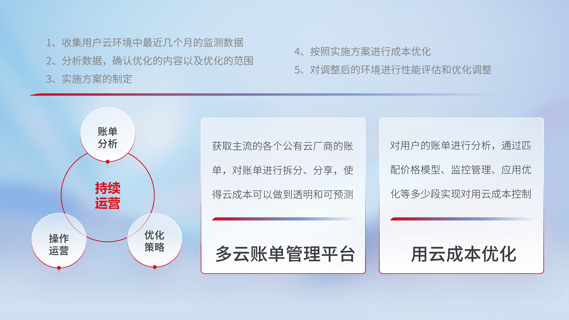 通过多云纳管,,以统一的资源数据模型把客户的云资源进行抽象和封装,,,进而实现对多云资源的统一操作,,保障云资源管理的可靠性、、稳定性与可用性。。量身定制化运维内容,,,配置、、、开发运维、、、、补丁管理、、、、备份、、、监控、、认证和访问管理、、、审计和日常巡检等,,,,保障在用云过程中的可靠度,,,,稳定度以及高可用率。。