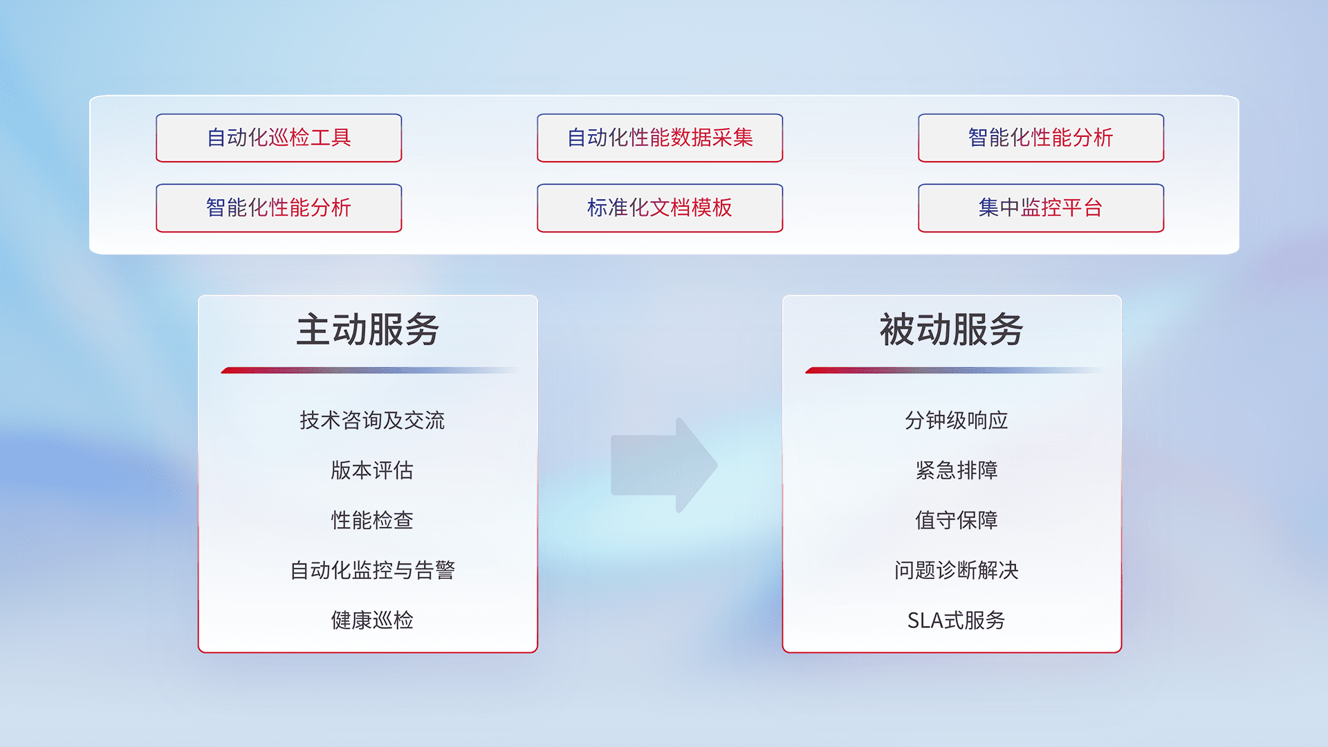 智能化工具和标准化文档,,,,保障服务质量,,,,提供主动服务(包含技术咨询、、、、版本评估、、、、性能检查、、、、自动化监控与告警、、健康巡检)和被动服务包含(分钟级响应、、、、紧急排障、、、值守保障、、、、问题诊断解决、、SLA服务)。。